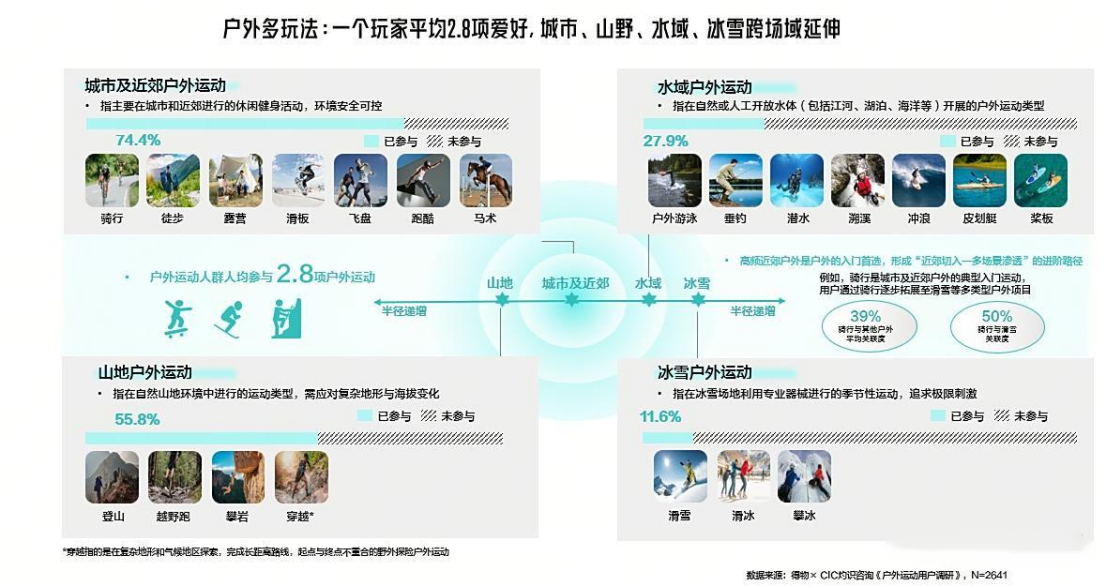 作为户外消费的主力军,Z世代的消费特征正深度影响行业走向。他们不仅偏好跑酷、滑板、潜水等具有挑战性的运动项目,更展现出"高忠诚度、长周期"的消费特质——超30%用户会一次性购置同品牌整套装备,96%明确表示未来将持续在户外装备上投入。与Z世代的"硬核偏好"形成鲜明对比的是,80、90后更青睐垂钓、露营、溯溪等松弛型运动,代际差异让户外消费市场呈现多元化分层。值得注意的是,随着奥运会、冬奥会等大型体育赛事的持续推动,国民运动意识不断提升,户外消费已形成城市近郊、山野、水域、冰雪四大圈层,且呈现"距离城市越远,运动进阶属性越强,装备预算越充裕"的特征,初阶玩家"选场域再选项目"与进阶玩家"选项目再匹配场域"的分化趋势愈发明显。