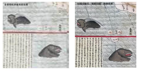 全景相机(左)和扫描全能王“无限扫描”(右)拼接效果局部清晰度对比图