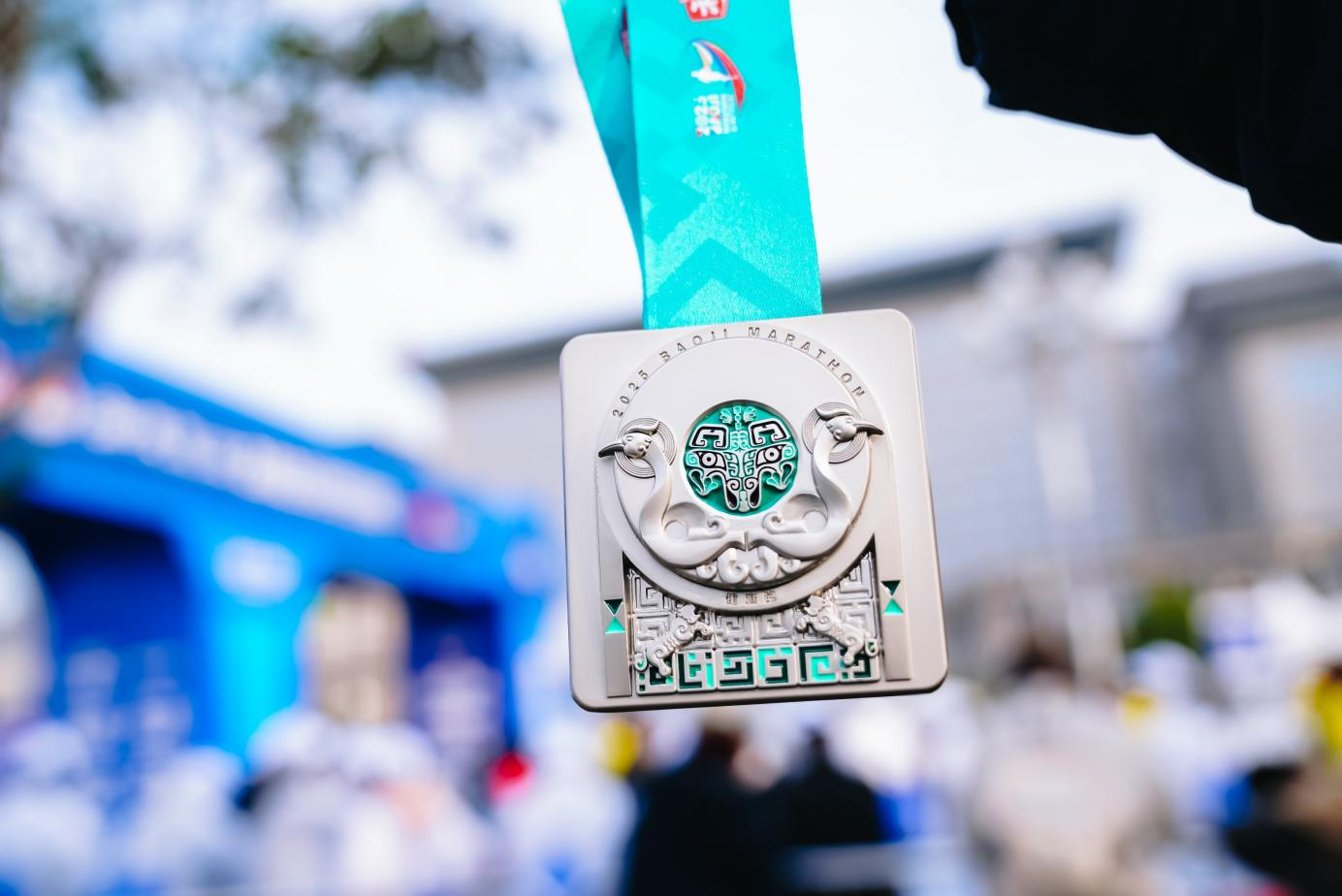 文化元素的深度植入,让赛事超越了单纯的体育竞赛范畴。参赛服上的青铜器纹样与完赛奖牌中嵌入的何尊铭文“中国”二字及社火马勺脸谱,让周秦文化与非遗技艺在现代体育中焕发新生。其中,灵官脸谱作为隐藏款盲盒,增添了赛事趣味性。“这枚奖牌,是一件兼具收藏性和观赏性,且浓缩了宝鸡地域文化特色的纪念品。”来自广东的跑者黄女士感叹道。