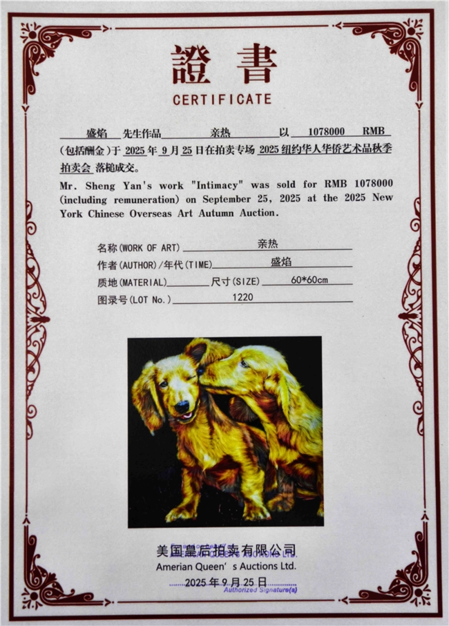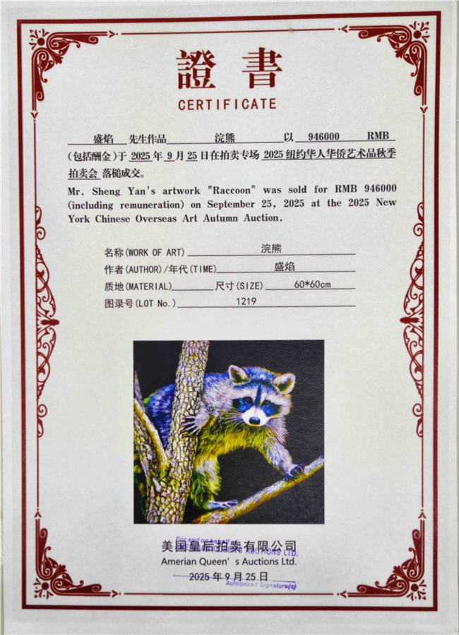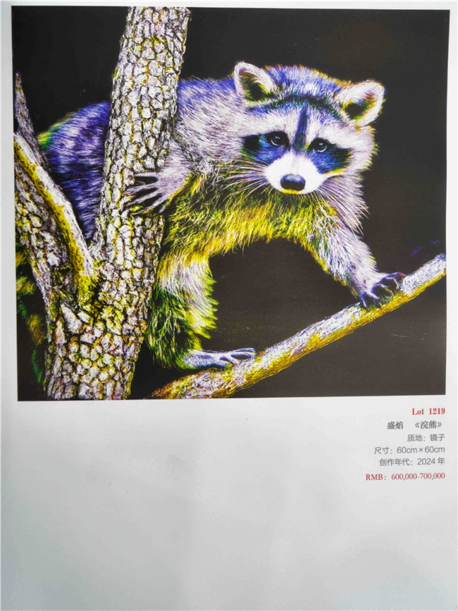 "中华镜面光雕画之父"盛焰博士的两幅作品《浣熊》与《亲热》,正以刀锋雕刻的光影韵律,在西方艺术市场掀起一场东方美学的风暴,让全场藏家的呼吸都随着竞价阶梯同步起伏。