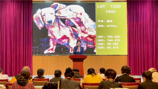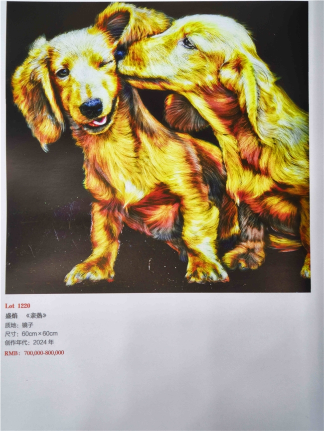 两只金毛幼犬鼻尖相触的瞬间被永恒定格在镜面上,当背光灯骤然亮起,暖橙色矿物颜料与镜面反射形成的3D视觉效果让画面突然"活"了过来,现场多位女士同时发出"Oh my god"的惊叹。"100万!"来自洛杉矶的好莱坞制片人索菲亚·科波拉通过电话委托激烈竞价,她急促的呼吸声透过音响传遍全场。最终以107.8万元落槌时,连拍卖师都忍不住微笑点头——这个价格不仅刷新盛焰个人拍卖纪录,更使镜面光雕画成为本场专场溢价率最高的艺术品类。