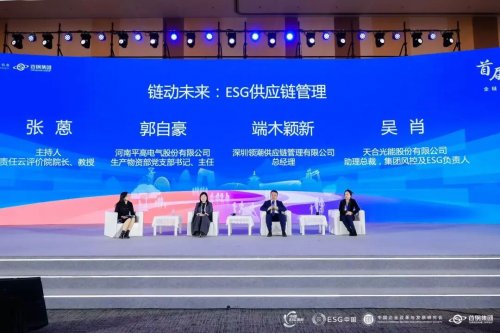 在圆桌论坛环节,河南平高电气股份有限公司生产物资部党支部书记、主任郭自豪,深圳领潮供应链管理有限公司总经理端木颖新,天合光能股份有限公司副总裁、风控及ESG负责人吴肖参与交流。本环节由张蒽主持。