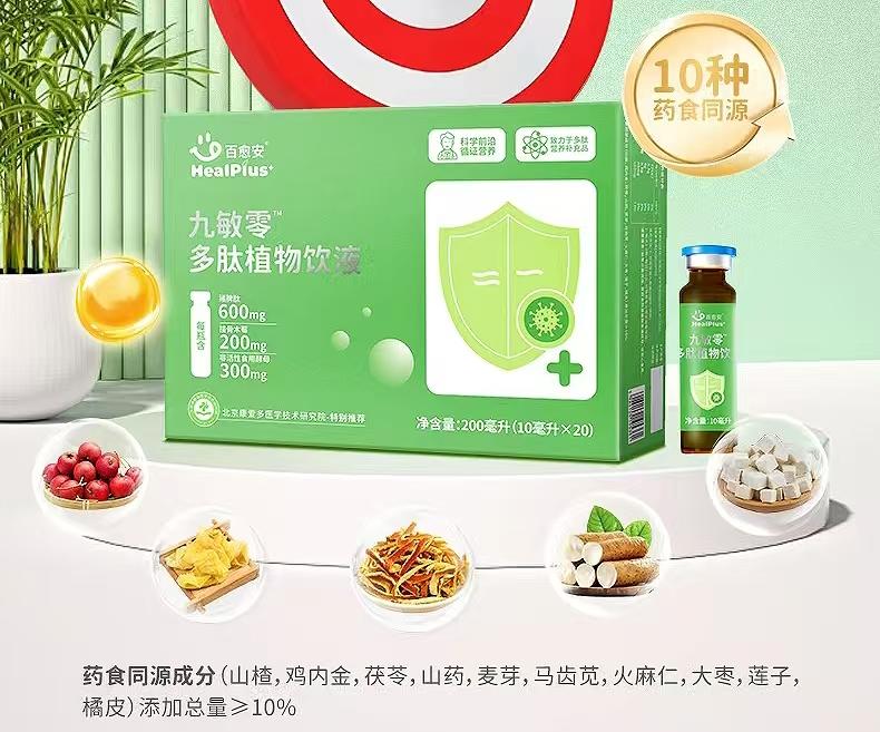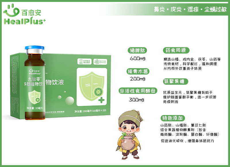 说到调理,专注儿童体质定向调理的品牌“百愈安”一直相信药食同源的力量。像山楂、山药、茯苓这些食材,既是食物也是传统中药材,对调理脾胃很有帮助。而针对中国孩子过敏体质问题研发的九敏零多肽植物饮液就特别加入了这些成分。