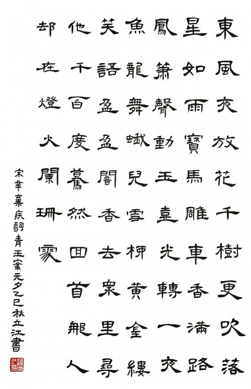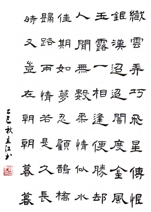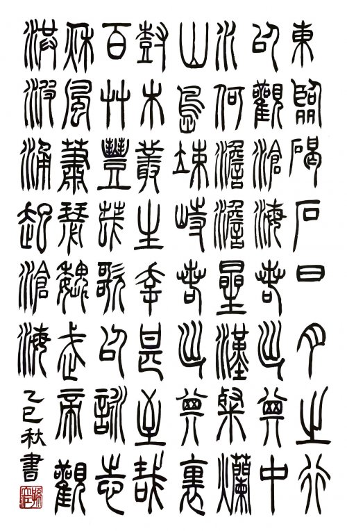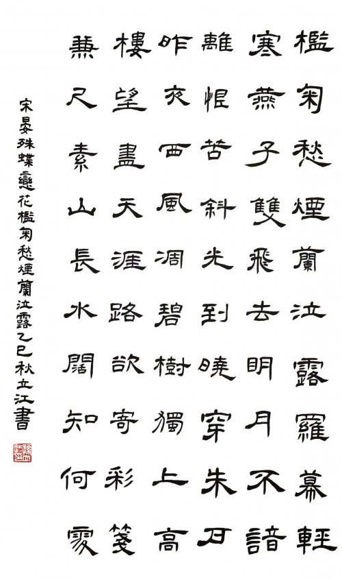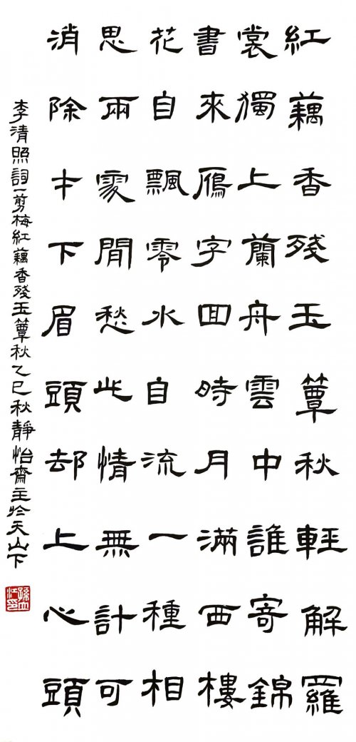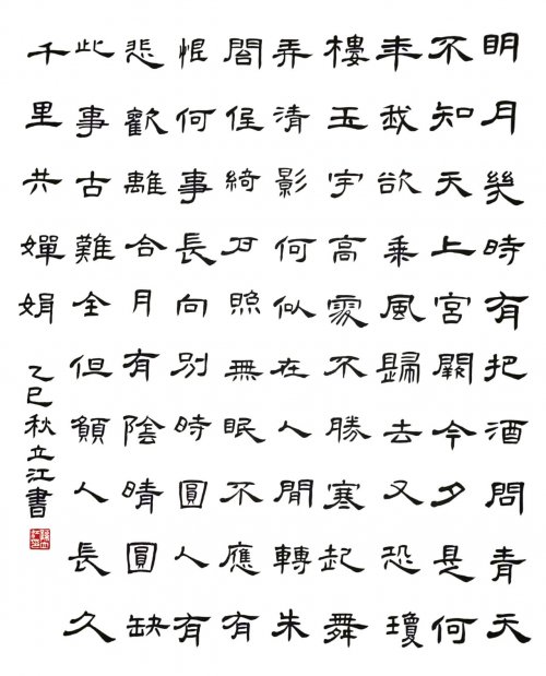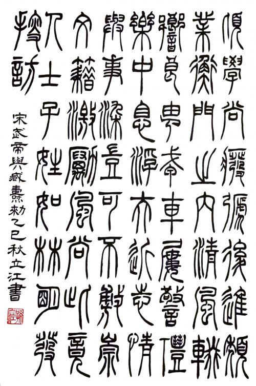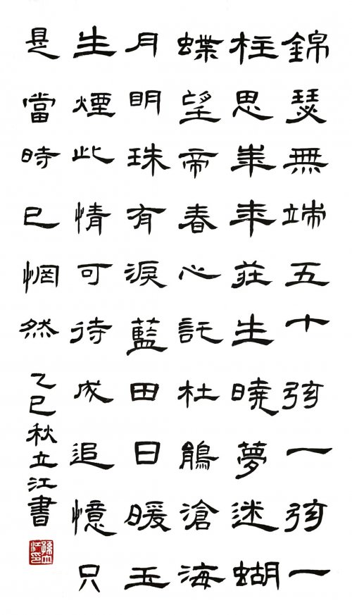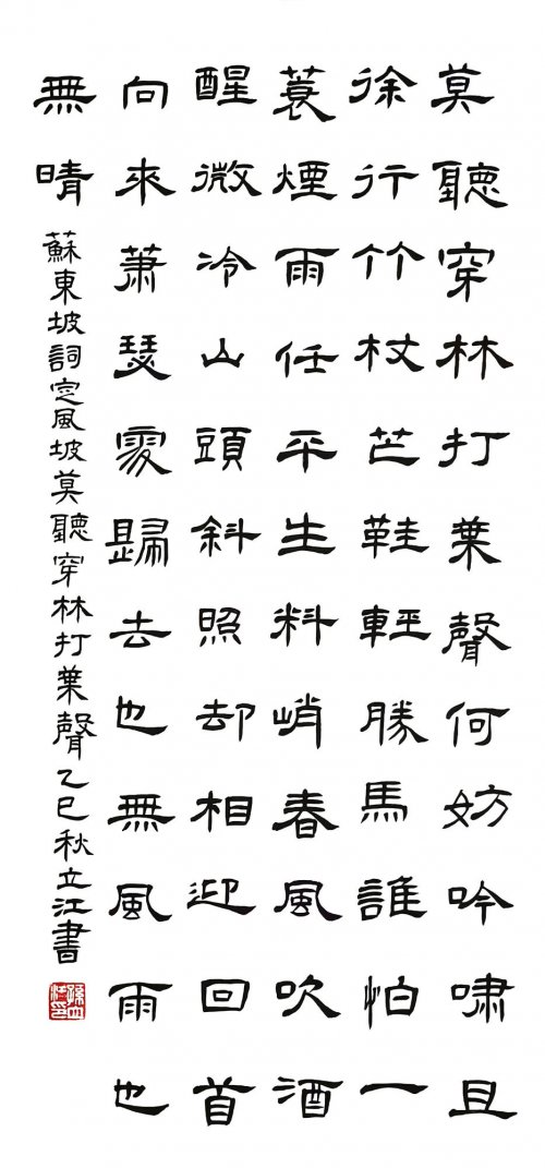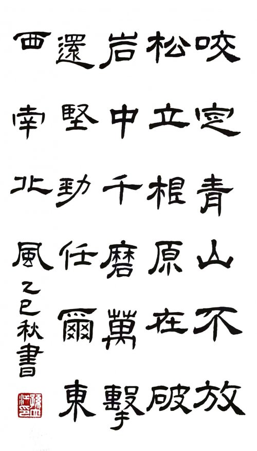 孙立江,号静怡斋主,又号庭州散人,1967年出生于新疆吉木萨尔县(唐朝时为北庭都护府),喜好书法,专注深耕,尤擅且钟情隶书与篆书,以数十年如一日的临摹坚持,夯实笔墨根基。2002年后,拜焦墨山水画大家赵剑溪为师。在赵老师的悉心教导和鼓励下,根植传统,与《曹全碑》相伴十余年,沉浸其间,尽得此碑秀雅灵动、圆转温润的汉隶精髓;于篆书领域,他广涉经典,不仅坚持临习李斯《峄山碑》的严谨端庄与线条匀净,以及李阳冰《千字文》的瘦劲挺拔,更对吴让之篆书偏爱有加,反复揣摩《吴均帖》《观沧海》《宋武帝与臧焘敕》等代表性碑帖,力求在笔墨间传递出篆书的古朴厚重与灵动气韵。