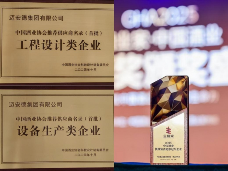 迈安德的技术实力,接连获得行业的权威认可。2024年,在中国酒业协会公布的首批中国酿酒行业推荐供应商名录中,迈安德成功入选“工程设计”与“设备生产”双类别推荐供应商,成为该名录中唯一一家同时获此两项认证的原粮预处理装备供应商;翌年,迈安德又在济南中酒展上脱颖而出,荣膺“2025中国酒业机械装备隐形冠军企业”称号,充分印证了其在智能酿造装备领域的技术实力与行业贡献。