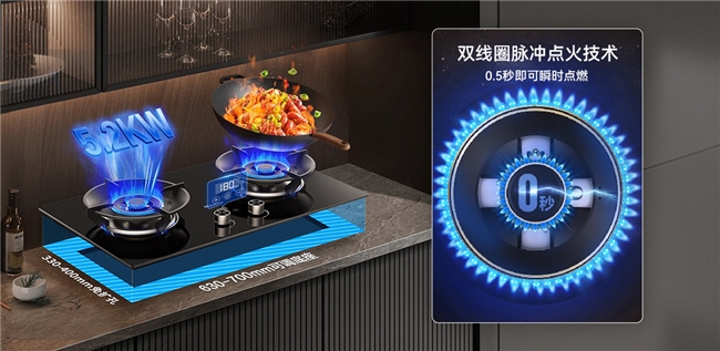 灶具同样表现出色,配备双线圈脉冲点火技术,仅需0.5秒即可瞬时点燃,火力稳定且不中断。无论是快速翻炒、慢火炖煮还是长时间煲汤,都能精准掌控火候,无需多次尝试点火或担心火力不稳,让整个烹饪过程更加便捷,从容享受做饭的乐趣。