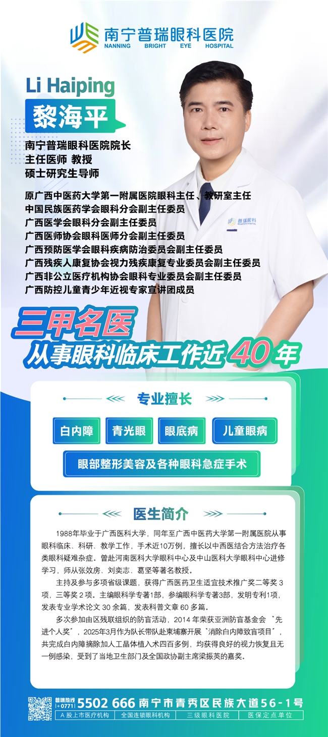选择南宁普瑞眼科医院,是因为这里的理念和我一致:专注眼科、服务百姓,尤其是关注基层患者的需求。很多农村地区的老人,因为交通、信息不通,耽误了治疗,我希望能借助普瑞的平台,把更优质的眼科技术带到基层,让更多像彭弟、万娜这样的患者,不用跑远路就能治好眼睛。