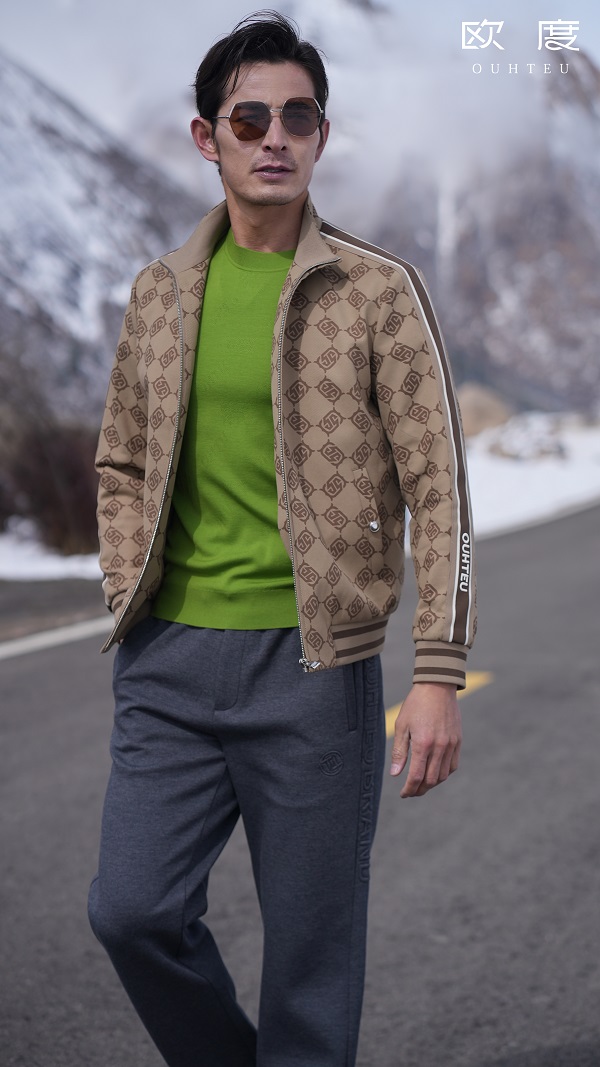 潮流并非盲从,而是有态度的自我彰显。欧度这件变形LOGO老花棒球领夹克,便是对当下“实用主义奢华”风潮的回应。它将运动服的舒适性与高级时装的细节感融为一体,满身的品牌印花不再是简单的标识,而是演化成为一种具有辨识度的美学图案。内搭的绿色软糯羊毛衫,在材质上与外套形成层次,色彩上则延续了活力。下搭的简约深灰色休闲裤,确保了视觉焦点集中于上半身的精彩。