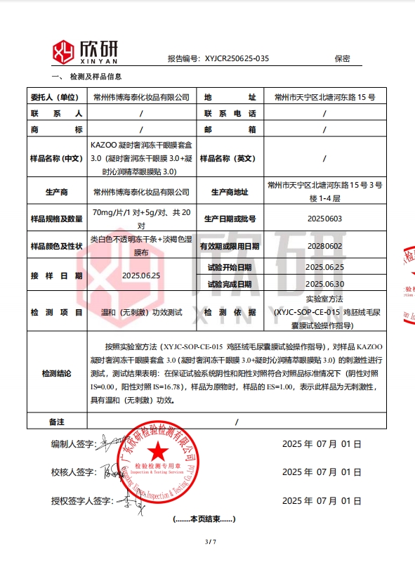 伟博海泰冻干技术不仅改变了传统护肤品的液态形态,实现了化妆品生产从液态到固态的根本性转变,更通过超低温速冻、真空干燥的方式从源头规避防腐剂等添加物可能引发的致敏风险,为敏感肌使用可逐冻干眼膜筑牢更高安全防线。伟博海泰利用制药级流程工艺控制进一步阻断了污染路径,使得可逐冻干眼膜无需依赖防腐剂即可实现长期稳定保存。可逐冻干眼膜通过多重安全性测试,并通过微生物检测与人体安全性验证(报告编号:XYJCR250625-035),显示可逐冻干眼膜温和无刺激适用于各类肌肤。