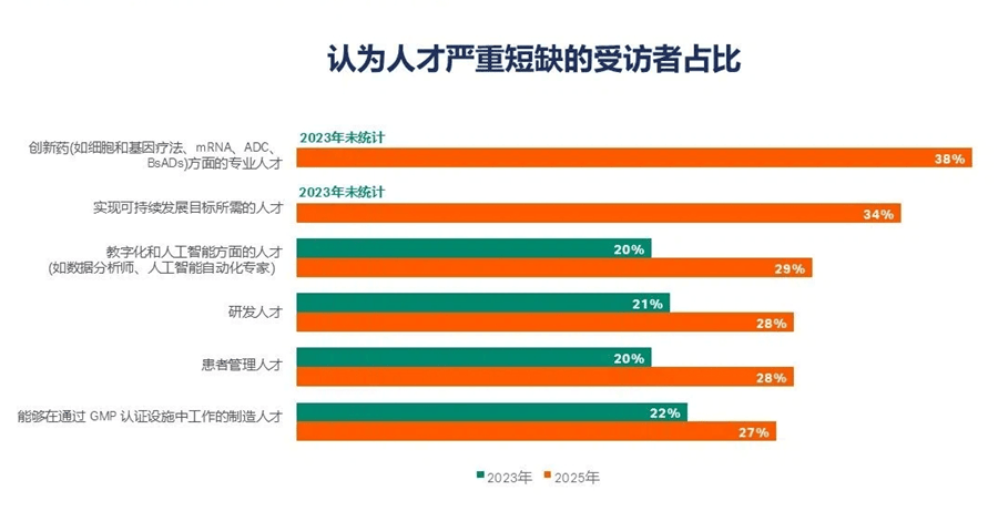 2.新型疗法人才短缺:38%的受访者表示细胞与基因治疗、mRNA、抗体药物偶联物(ADC)、双抗(BsAbs)等新型疗法方向的专业人才最为紧缺。此外,可持续发展相关人才,数字化与人工智能方面的人才也呈现较大缺口。