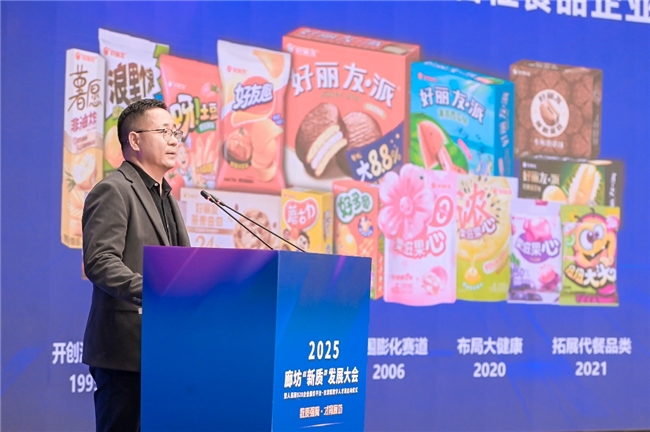 高显在演讲中强调,好丽友将“民以食为天,食以安为先”的行业准则升华为“为家人做产品”的品质守护,为中国的消费者制作安心、美味、健康的食品。这一理念贯穿全产业链管理:好丽友核心原料全球甄选。面粉原料选用优质进口原麦,委托国内知名企业定制加工,全程恒温储运。奶粉选用全球优质产区法国、新西兰的奶源,安全、营养、风味俱佳。2006年,好丽友正式进军薯片领域。为确保原料供应,好丽友将产业链进一步向上游延伸,在内蒙、广东等地设立土豆农场。2024年10月沈北新区土豆仓库及雪花全粉生产基地投产,标志着好丽友实现马铃薯种植、储运、深加工全产业链布局,对于保障旗下薯片及膨化产品原料品质及安全具有重要意义。此外,好丽友廊坊工厂还研发、构建了全面品质管理体系(TQM),通过实时监控生产参数、智能分析历史数据,动态优化工艺流程,以先进的自动化生产线配合数字化监控系统,实现全程数字化品质管理。