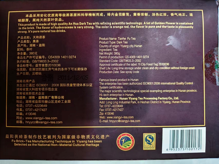 湖南·益阳茶厂有限公司位于湖南省益阳市赫山区龙岭工业园,黑茶经过发酵后在清洁防潮无异气味的条件下可长期保存,年份久远,茶的营养价值更高,口味更加浓郁,天和茯茶 ,属于湘益茯茶的产品,采用安化优质高等级黑茶原料科学精制而成,砖内金花普茂,菌香浓郁,汤色红浓,香气纯正,滋味醇厚,属纯天然茶叶饮品。