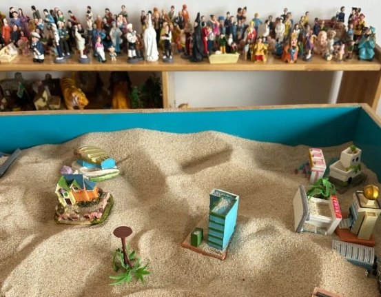 · 我们怎么做: 在一个有沙子和无数微缩模型的架子的房间里,我们告诉孩子:“这里是一个神奇的世界,你可以用任何你喜欢的方式,创造出任何你想要的场景。”