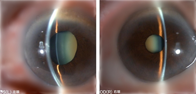 (此为双眼术前图,左眼青光眼发作,瞳孔大,虹膜萎缩,角膜水肿)