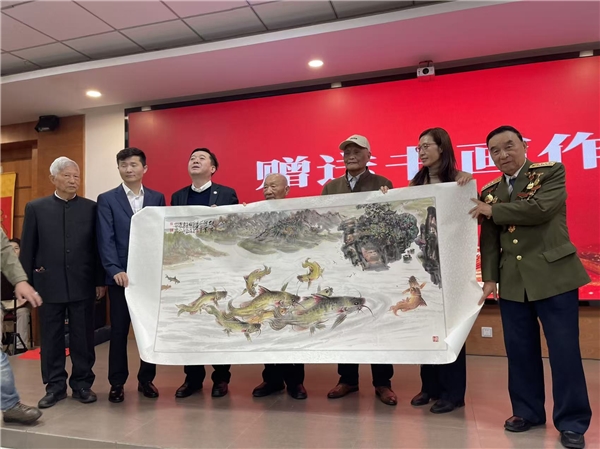现场气氛热烈融洽,笔墨书香氤氲其间。书画艺术家们以笔为媒、以墨传情,向老将军、老英雄们赠送精心创作的佳作。著名书画大师齐白石后人朴喆女士带来寓意“福如东海,寿比南山”的寿桃画作,以经典笔墨致敬长辈;画家万志尧先生挥毫创作大幅山水画,紧扣“绿水青山就是金山银山”的理念,将作品赠予承办单位;著名飞行员书法家张才题写《鹏程万里》,笔力遒劲,为活动增添豪迈气韵;安徽省知名画家、画淮王鱼创始人童文和先生专程携多幅作品赴会,以丹青描绘祖国繁荣昌盛、人民安居乐业的图景,寄托“富裕”之愿;山西太原的周金玺先生自驾赴京,带来饱含敬意的书法作品,为老前辈祝寿。