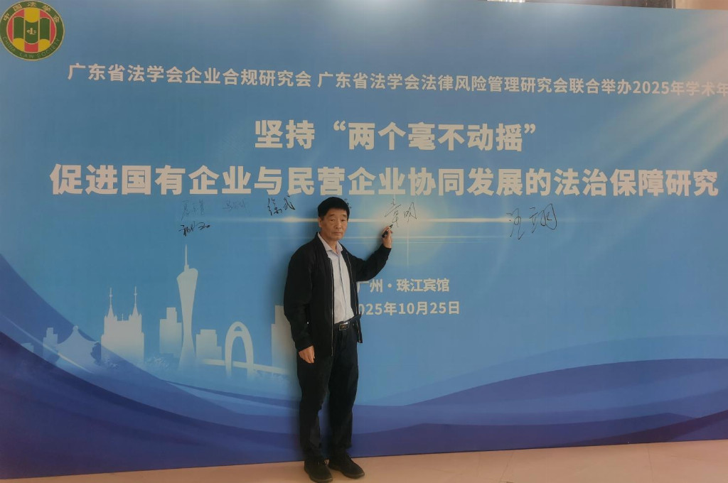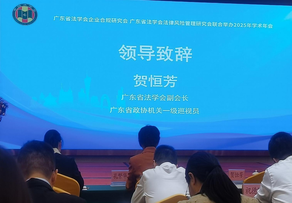 2025年10月25日。广东省法学会企业合规研究会、广东省法学会法律风险管理研究会在广州市珠江宾馆三楼多功能厅举行2025年学术年会。主题为《坚持“两个毫不动摇”,促进国有企业与民营企业协同发展的法治保障研究》