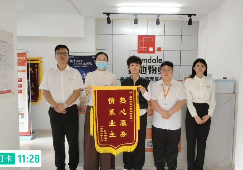 2025年9月28日,嘉泽苑项目15号楼业主商女士将一面锦旗送至物业服务中心,并向项目现场负责人柏盈盈经理和管家郝瑾瑄表达感谢。