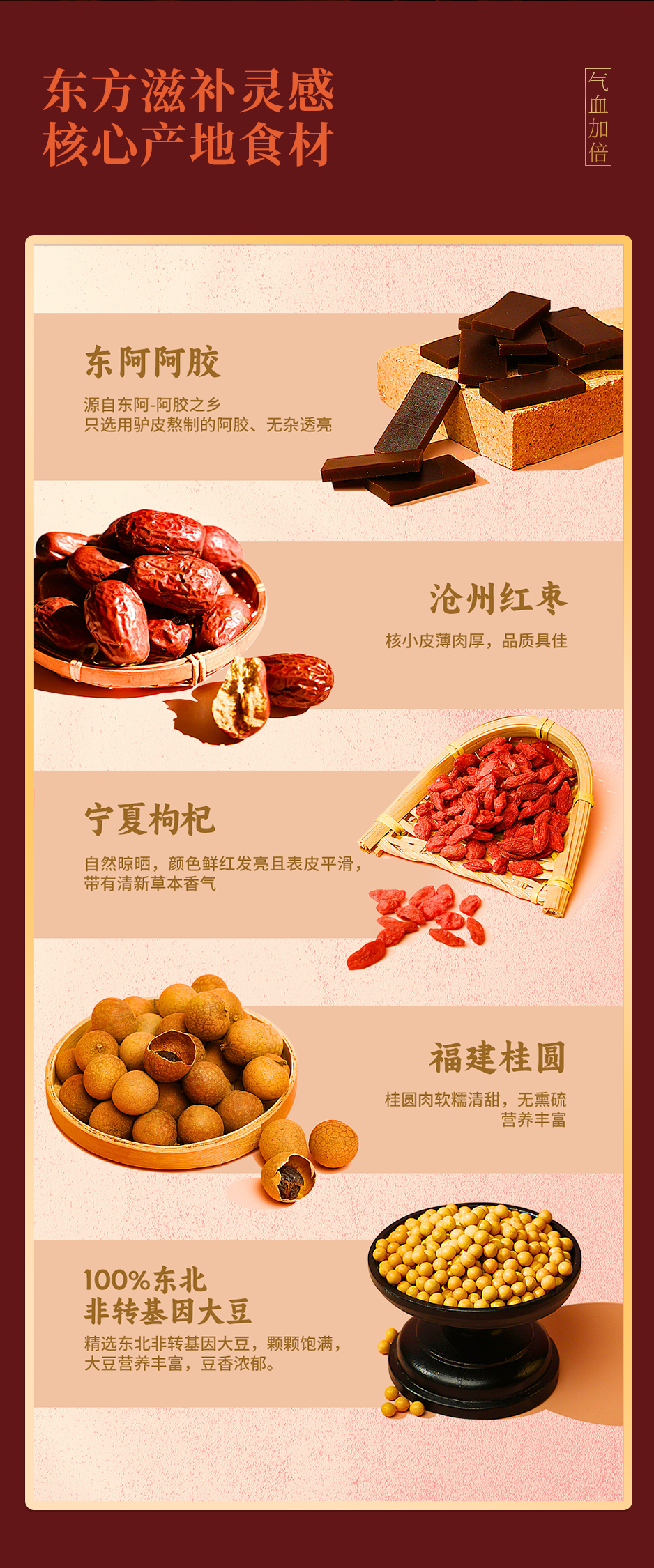 不仅如此,阿胶红枣食养豆浆粉中使用的是沧州红枣,与东阿阿胶相得益彰。红枣品质上乘,滋味天然甘甜,特性温润,有健脾益胃、增强阿胶的补益效果。在阿胶红枣的基础上,还加入了宁夏枸杞与福建桂圆。枸杞经过自然晾晒,颜色鲜红发亮,富含多种营养素,为产品增添一份护眼能量与明亮生机;桂圆无熏硫加工,肉质软糯清甜,为美味加分,为安神补血加码,更能抚慰秋冬身体的躁动与疲惫。