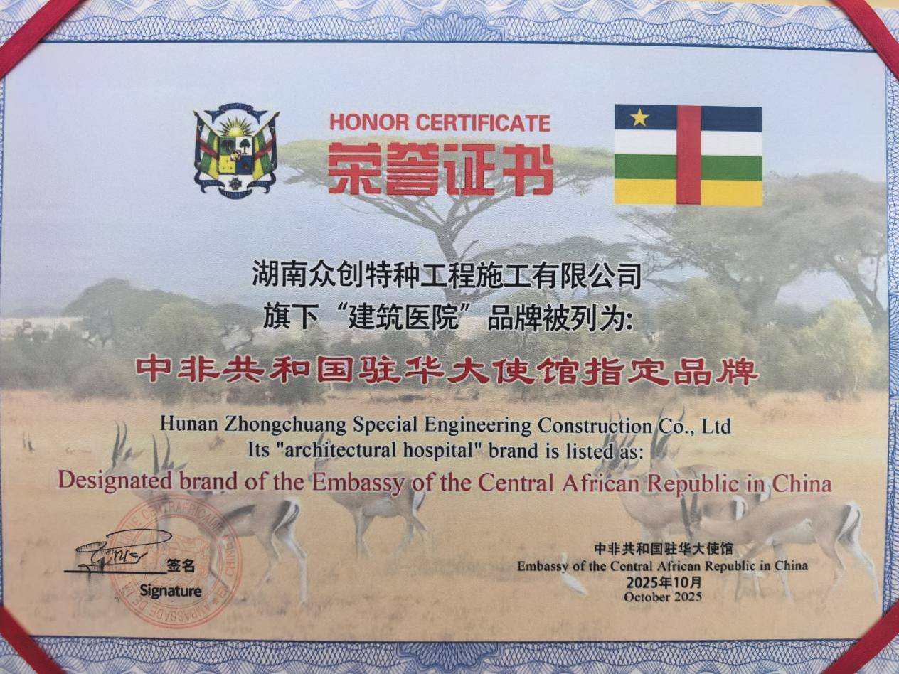 中非共和国驻华大使馆正式聘任罗刚先生为“驻华大使馆特邀建筑行业顾问”,并授予湖南众创特种工程施工有限公司旗下“建筑医院”品牌“中非共和国驻华大使馆指定品牌”荣誉。这一重要成果,标志着“建筑医院”的创新模式与专业能力获得了国际层面的关注与信任。