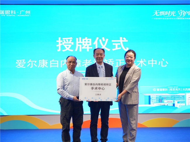 随着活动的深入,“爱尔康白内障老视矫正手术中心(三焦点)”项目授牌仪式隆重举行。爱尔康飞白全国销售经理王惠女士为广州普瑞眼科医院颁发“白内障老视矫正手术中心(三焦点)”牌匾,沙翔垠教授、杨为中教授代表医院上台接牌。