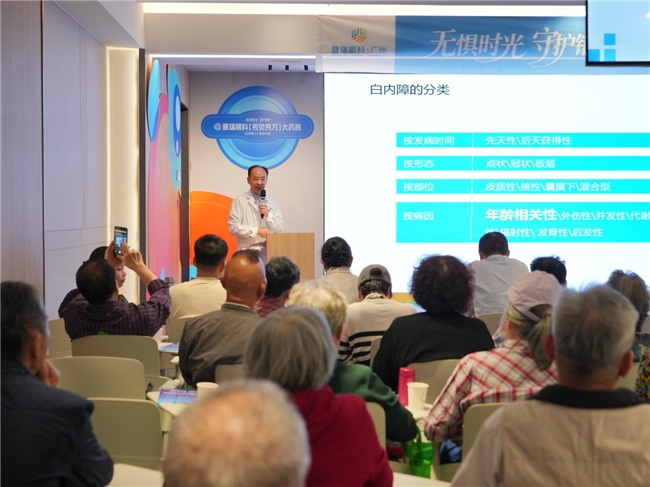 活动现场,沙翔垠院长以《认识白内障》为题,为到场嘉宾与居民带来了一场生动实用的科普讲座。他指出,白内障是全球首位的致盲性眼病,年龄相关性白内障是最常见的白内障类型,我国60岁以上人群白内障发病率为80%。目前手术是治疗白内障唯一切确有效的方法。沙翔垠院长结合临床案例,深入浅出地讲解了白内障的成因、治疗时机和晶体选择要点,并耐心解答了参会长者的提问。这场讲座不仅让观众学到实用知识,更唤醒了大家对自身眼健康的重视。