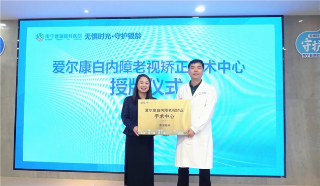 同期,爱尔康公司广西区域经理吴女士,代表爱尔康公司为南宁普瑞眼科医院举行“爱尔康白内障老视矫正手术中心” 授牌仪式。爱尔康作为知名的眼科医疗企业,此次授牌是对南宁普瑞眼科疗领域技术实力、服务质量的高度认可。未来,双方将深化合作,为患者提供更优质的白内障老视矫正手术解决方案,帮助中老年患者改善老视问题,提升术后视觉质量。