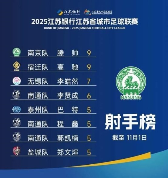 2025江苏省城市足球联赛“苏超”最终射手榜 滕帅高驰李皓然李贤成领衔