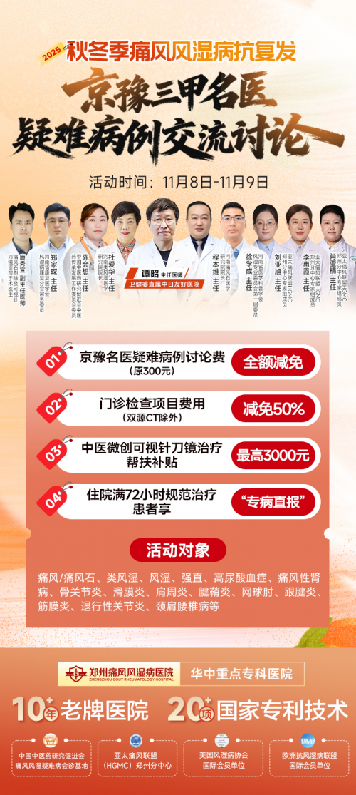 秋冬时节气温逐渐走低,早晚温差显著增大,痛风及风湿病患者在受凉受寒后,极易出现关节疼痛、活动受限等症状,甚至诱发疾病发作或加重。临床统计数据表明,痛风和风湿病患者在初治愈的前3-5年易受外界多种因素影响、复发概率相对较高,而经过抗复发治疗、管理干预,能有效降低复发概率。为帮助广大患者做好秋冬季的抗复发管理,平稳度过季节交替期,全国痛风一张网·郑州基地——郑州痛风风湿病医院,将于2025年11月8日至9日,开展 “2025秋冬季痛风风湿病抗复发京豫三甲名医疑难病例交流讨论” 活动。活动将充分发挥三甲名医资源优势,开展疑难病例交流与抗复发及规范化诊疗指导,助力广大痛风风湿病患者回归健康正常的生活。