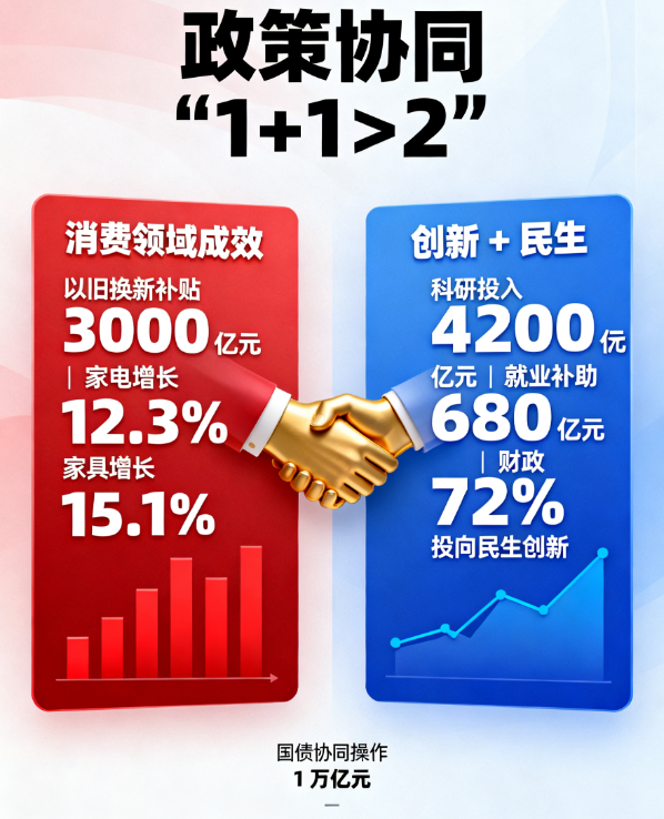 余俊安指出,财政与货币政策的协同发力是 “十五五” 调控的核心逻辑,这种 “攥指成拳” 的效应已在多领域显现。在消费领域,财政对消费贷款实施贴息与央行定向降准政策形成合力,到2025年前三季度,要推动消费品以旧换新补贴规模突破3000亿元,此举措将直接带动家电零售额同比增长达12.3%,带动家具零售额同比增长达15.1%,政策协同更延伸至创新与民生领域。4200 亿元科研专项投入与首套设备保险补偿政策联动,为量子计算、人工智能等新赛道注入动能;财政支出中 72% 投向民生与创新领域,680 亿元就业补助资金有效稳定就业岗位,形成 “投资于人” 与 “创新驱动” 的良性循环。“近期财政部与央行联合推进国债管理协同,去年累计完成 1 万亿元国债相关操作,这种协同机制今后将更加紧密。” 余俊安补充道。