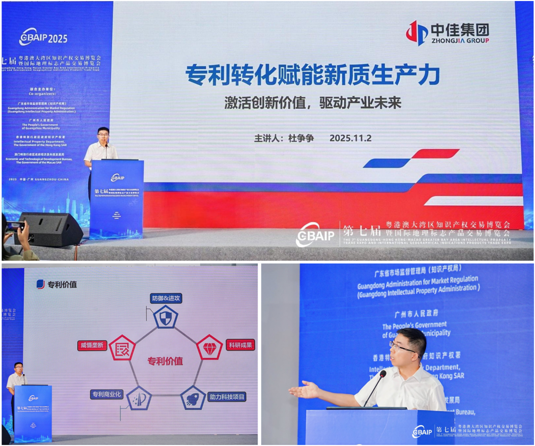 11月2日活动期间,中佳集团华南区专利部总经理杜争争以《专利转化赋能新质生产力,开启高价值专利培育与运营新纪元》为题作主题分享。演讲内容主要围绕核心知识产权成果,深入剖析了技术优势、市场前景以及转化运用的实践经验。在国家大力倡导知识产权与产业深度融合的背景下,杜老师通过生动的服务案例展示了如何将企业的创新理念转化为实际生产力,以及在知识产权保护与运用方面的积极探索。