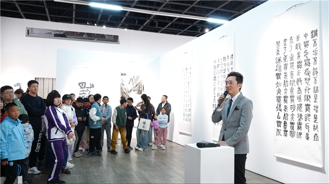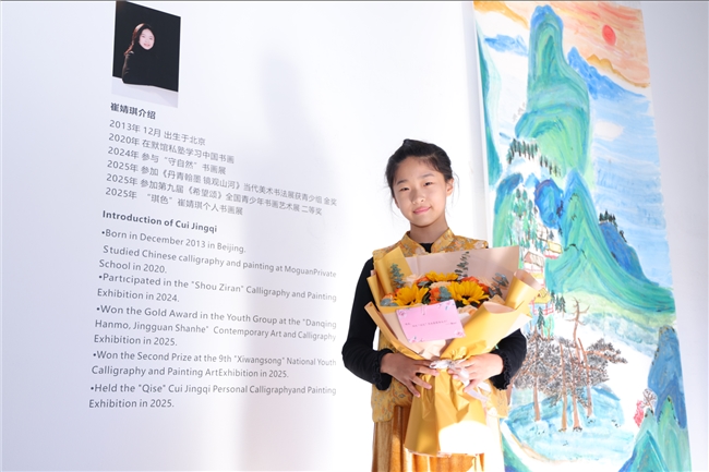 午后暖阳透过玻璃幕墙,轻柔地洒在展厅的每一幅作品上。现场嘉宾云集,笑语盈盈,空气中弥漫着墨香与期待。年仅11岁的崔婧琪立于其间,从容娴静,其眸中闪烁的,是对艺术的赤诚与对这场人生重要时刻的珍重。