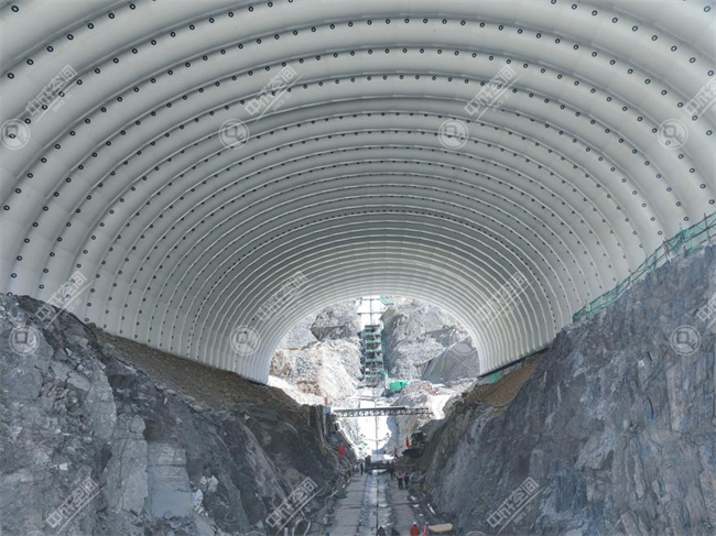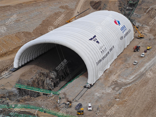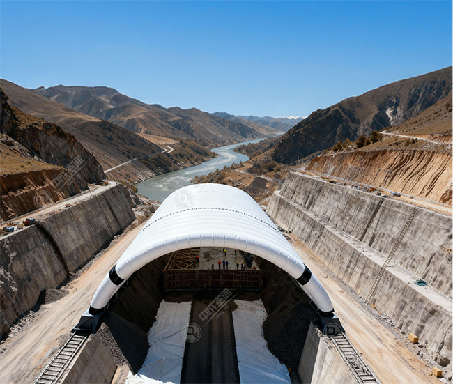 中成空间大跨度可移动式气肋气膜仓,专为高寒高海拔地区工程建设量身定制,可应用于水电站坝体填筑、骨料加工系统、大型设备材料存储等关键环节,有效解决高海拔地区工程施工防风、防雨及冬季保温难题,既筑牢工程质量防线,又大幅提升工程效率。
