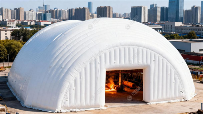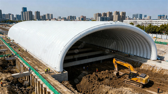气肋式结构双层膜材,保温防风性能优异,可在-40℃极端低温环境下稳定运行。经实测,结构支撑力≥20kg/㎡,能轻松抵御10级大风、强降雨、暴雪等恶劣天气,隔绝风雪侵袭,确保施工不受天气干扰,保障每日有效施工时间,显著缩短整体工期。