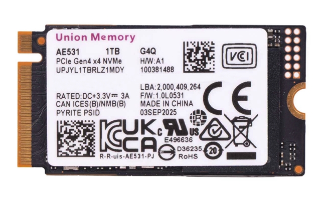 忆联AE531提供512GB、1TB和2TB三种容量选项,M.2 2242/2280两个规格可选。本次我们评测的是M.2 2242规格1TB型号。