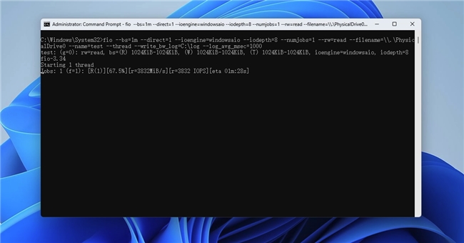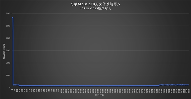 在无文件系统条件下使用IOMeter进行128KB QD32顺序写入测试3600秒,每秒记录。空盘状态下忆联AE531 1TB能提供大约110GB的可用SLC写入缓存空间,缓存外的顺序写入速度超过220MB/s,这个阶段持续120秒左右,也就是大约26GB的容量。在此之后是边释放缓存边写入的阶段,顺序写入速度大约165MB/s。忆联在官网的产品中明确给出AE531 1TB的QLC顺序写入速度是160MB/s,这是一个非常务实的态度:性能指标按最恶劣条件标定,而不是很多品牌所做的那样全部朝理论最高极限值标注。