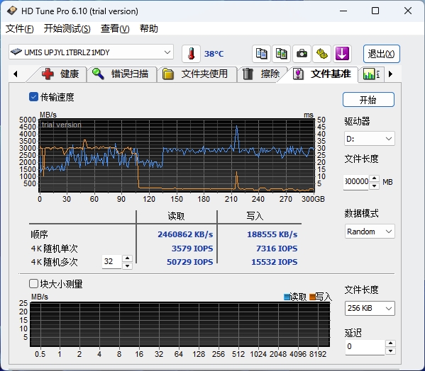 建立分区并格式化,利用IOMeter向盘内填充517GB的不可压缩数据,闲置15分钟后进行HDTune文件基准测试,此时忆联AE531依然能够提供大约110GB的SLC写入缓存空间,过半盘使用的性能可以得到充分保障。