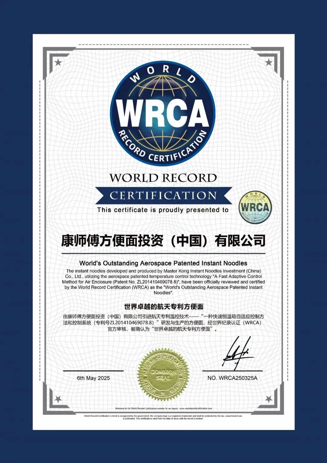 2025年,康师傅获得WRCA“世界卓越的航天专利方便面”认证。自2017年成为中国航天事业合作伙伴伊始,九年来,康师傅通过航天科普进校园、青少年航天梦想体验营等多项活动助力航天事业。