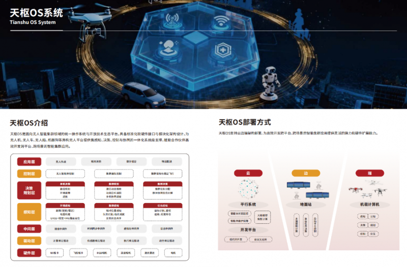 天枢OS是面向无人智能集群领域的统一操作系统与开放技术生态平台,具备标准化软硬件接口与模块化架构设计,为无人机、无人车、无人船、机器狗等异构无人平台提供集感知、决策、控制与协同的一体化系统级支撑,赋能合作伙伴高效开发跨平台、跨场景的智能集群应用。