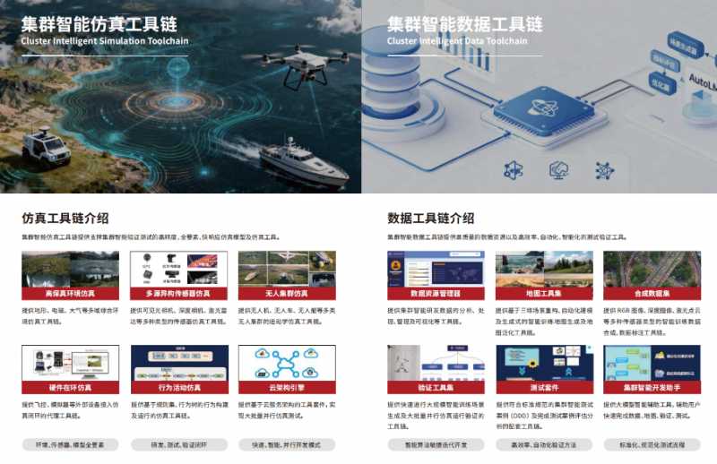 集群智能开发平台作为前沿创新的核心引擎,依托仿真和数据两大工具链,攻克行业标准缺失与验证复杂性难题,为集群智能研发注入核心动力。其中,仿真工具链以模块化、组件化的方式集成高保真仿真环境和高精度模型,提供强大的分布式并行计算与硬件在环能力;数据工具链提供丰富的地图、合成数据、验证工具 及测试套件。