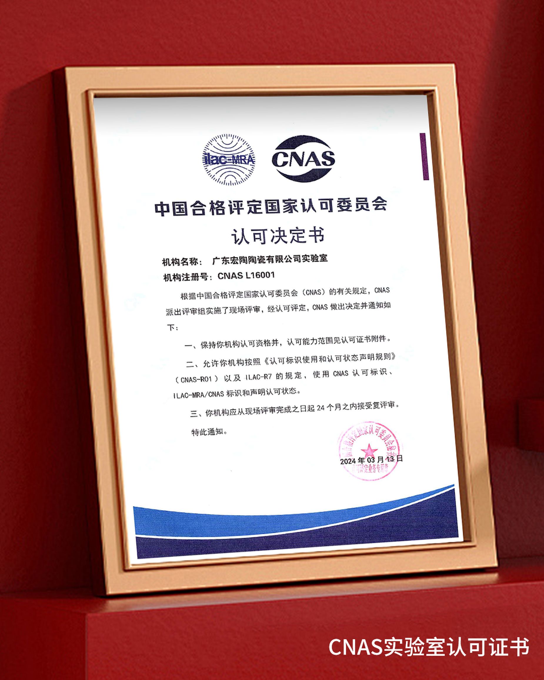 此外,宏陶瓷砖依托国家CNAS认证实验室,深度融合权威高校的产学研合作,系统化验证产品强度、耐磨、防滑、耐化学腐蚀等维度的性能,不仅为5A品质提供坚实的科学支撑,更持续推动宏陶产品创新与技术迭代。