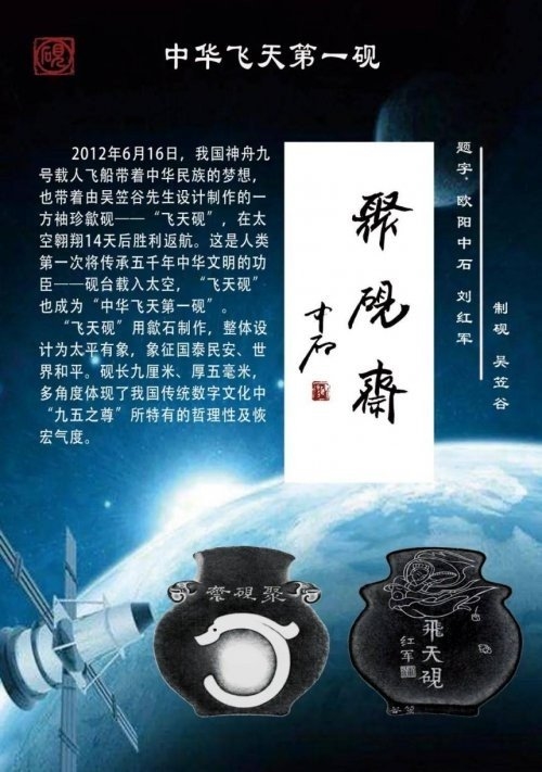 而中华飞天砚,出自名师吴笠谷之手,砚堂雕刻中华第一龙“C形玉龙”造型,砚额雕刻:欧阳中石题“聚砚斋”三字,砚背刻敦煌飞天造型和刘红军将军题字“飞天砚”,属歙砚,整体设计为太平有象,象征国泰民安、世界和平,采用龙尾山四大名坑(金星坑)砚石精心雕刻而成,砚长九厘米,厚五毫米,从多角度体现了我国传统数字文化中“九五之尊”所特有的哲理性和恢弘气度,上有华美的石品金星、多墨池造型采用新石器时代红山文化“C”型玉龙。2012年6月16日,我国神舟九号载人宇宙飞船带着中华民族的梦想,也带着由吴笠谷先生设计制作的一方袖珍歙砚——“飞天砚”,在太空翱翔14天后胜利返航。这是人类第一次将传承五千年中华文明的功臣——砚台,载入太空,“飞天砚”也成为“中华飞天第一砚”。“飞天砚”,集名石名砚、名家雕刻、名人题铭、名牌出品于一身,加之一飞冲天,完成中华砚台腾飞传奇的“中华飞天第一砚”,已不是一方普通意义上的砚台,是砚中的鲲鹏,不仅具有观赏价值,也具有极高的纪念和收藏价值。