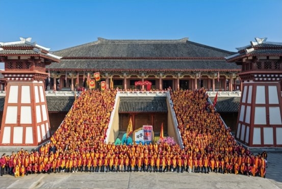 10月22日上午汉城景区德阳殿前,24名男演员身着御林军盔甲,手持长枪在城门口列阵威武站立迎八方来客。16名女舞蹈演员身着大红色迎宾汉服,呈八字形礼仪姿态迎接贵宾到来。本次活动的参会代表首先进行了集体合影留念,然后在汉城景区天街御道举办祭祀大典。伴随开始暖场短片“光武之路”的播放,祭祀活动进入倒计时,钟鸣9响之后,湖北省原副省长刘友凡担任主持人宣布祭祀大典开始。
