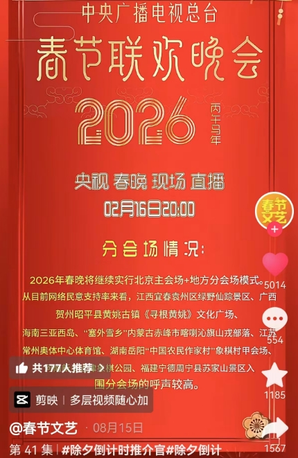 鉴于2024、2025年疫后恢复的春晚会场对地方城市曝光量、知名度的巨大提升和对地方经济显著的带动效应,2026年春晚将继续实行北京主会场+地方分会场模式,江西袁州《乡愁宜春》剧场、广西贺州昭平县黄姚古镇、“塞外雪乡”内蒙古赤峰山戎部落、“苏超”顶流江苏常州奥体中心、湖南岳阳农民作家村“象棋村甲”会场、海南三亚西岛的网络民意支持位居前列,而随着2026丙午马年总台春晚进入最后一百天的冲刺倒计时,马年春晚首批拟邀嘉宾也开始浮出水面。