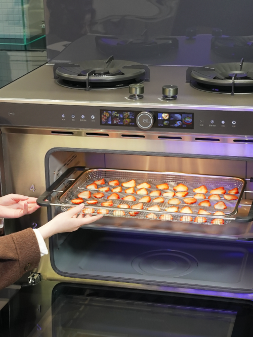 具体而言,这台底部蒸烤箱拥有蒸、烤、炸、炖等多种功能,可实现一机多用的出色效果,蒸鱼、炖汤、烤鸡翅、做果干等等,都能在它的帮助下一次出餐、轻松搞定。在细节方面,火星人集成灶采用触控式智能面板,操作界面非常直观,蒸烤温度、时间一目了然,长辈或者小白都能轻松上手。而且,它的台面采用纳米磨砂材质,防油防水、易清洁,做完饭后用抹布一擦即可焕然一新,堪称懒人福音。