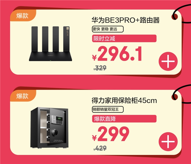 守护商业机密与核心资产,是办公场景不可或缺的一环。得力保险柜专为办公场景设计,其加厚钢板和C级锁芯能妥善保管合同、公章及机密文件,原价429元,活动价299元。定流畅的网络,同样是现代办公场景下的刚需。华为BE3PRO+路由器搭载Wi-Fi 7技术,办公室多设备同时在线也不卡顿,穿墙性能出色,原价329元,9号限时价296.1元。华硕RT-AX86UPro路由器适合大户型办公区,160MHz频宽让每个房间都信号满格,原价1299元直降600元,活动价599元。