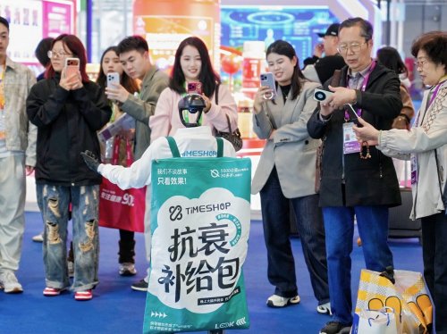 11月5日,第八届中国国际进口博览会在上海拉开帷幕。展会期间,在医疗器械与医药保健展区,一个身背巨大"TIMESHOP抗衰补给包"的人形机器人领着两只机器狗穿梭往来,与观众握手合影。在机器人的辅助引导下,Timeshop益生好展台人头攒动,观众或咨询产品细节,或领取"抗衰补给包"体验新品。