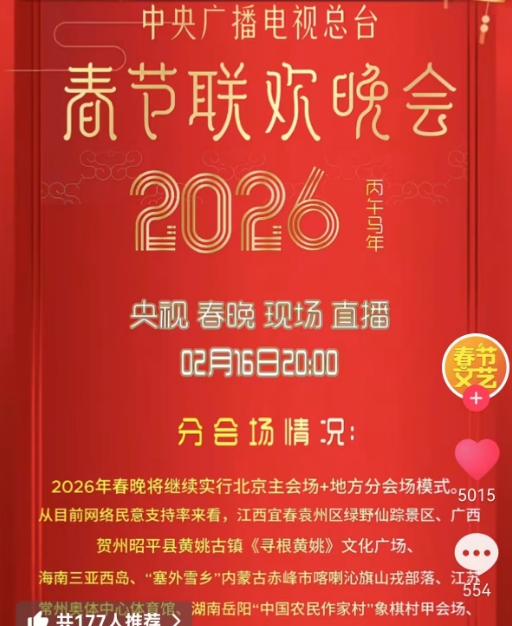 而鉴于疫后恢复的春晚会场对城市曝光量、知名度的巨大提升和对地方经济显著的带动效应,2026年春晚将继续实行北京主会场+地方分会场模式,网络民意支持率最高的江西宜春袁州区《乡愁宜春》水上剧场、广西贺州昭平县黄姚古镇、“塞外雪乡”内蒙古赤峰山戎部落、“苏超”顶流江苏常州奥体中心、湖南岳阳农民作家村“象棋村甲”会场、海南三亚西岛有份入围。