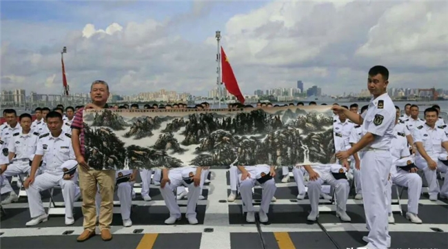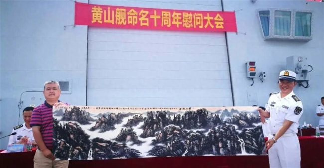 如果说世界上什么最宝贵,也许“爱”就是宝贵的东西,也是我们需要保护和发扬的东西。慈善是一种精神力量,它引导我们走向爱的彼岸。做善事不仅是物质方面给人以帮助,更重要是爱的传递。中国画与爱的相融也是更好建立了一条艺术与慈善的绵延长河。在这方面,为农先生就是为这条长河不断加水者之一,近二十年来,他从未间断过。从二00三年以来,他每年都要携带自已的山水画作品去当地或外地军营慰问軍人,从未间断。2017年他带着作品,作为黄山市唯一艺术家与党政代表团一起去南海慰问驻守在祖国南疆的黄山舰全体官兵。