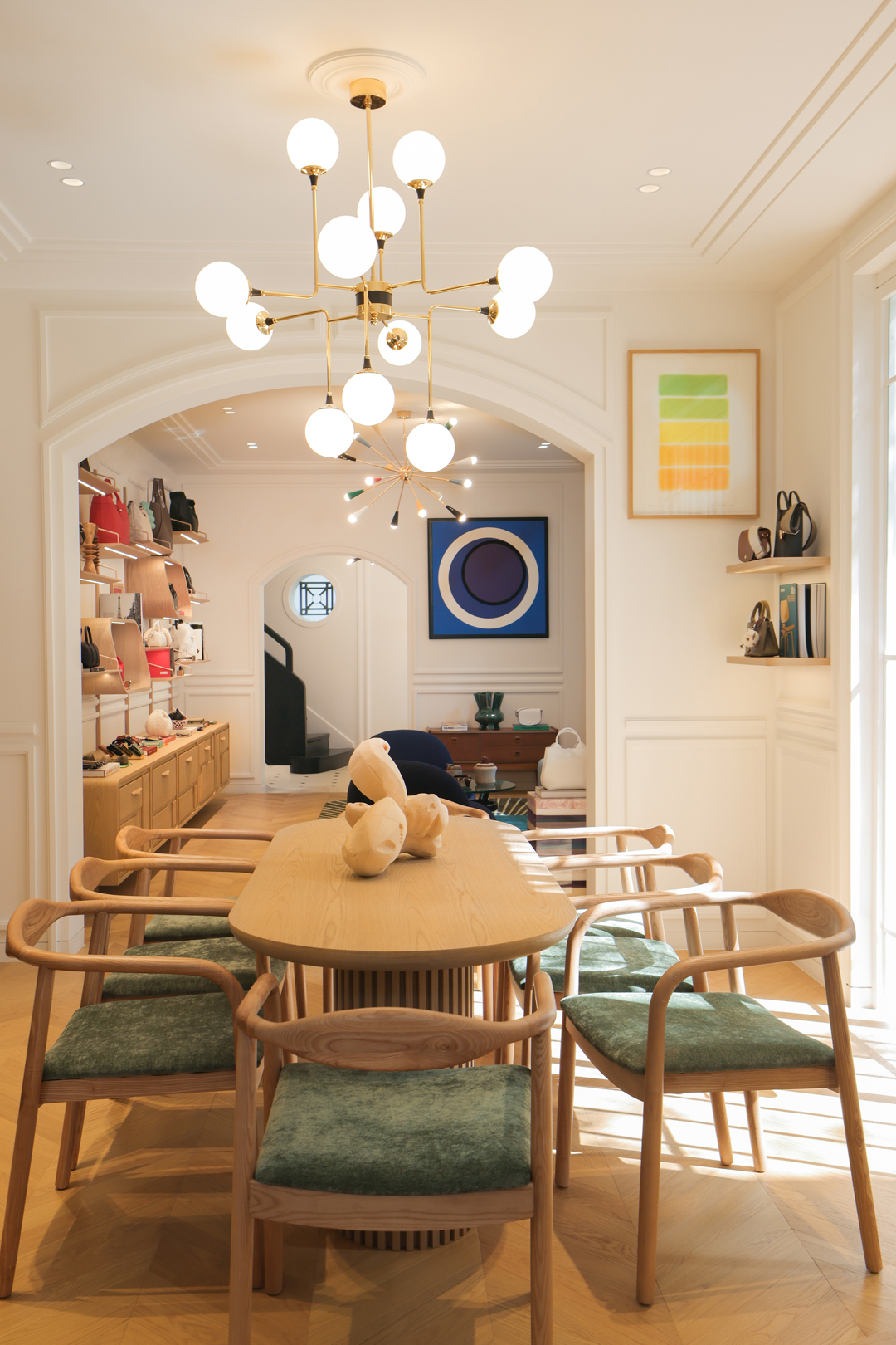 衣帽间展示鞋履、成衣与配饰,诠释珑骧女性的优雅与自信。空间内Etel Adnan的醒目版画增添浓郁艺术氛围,一对1958年Pierre Paulin设计的蘑菇椅与René-Jean Caillette 20世纪50年代的圆桌,融合复古与现代优雅。橱窗中摆放珑骧的珍藏物件——如马镫形时钟与办公配件,象征着品牌持久的工艺精神与时尚传承。