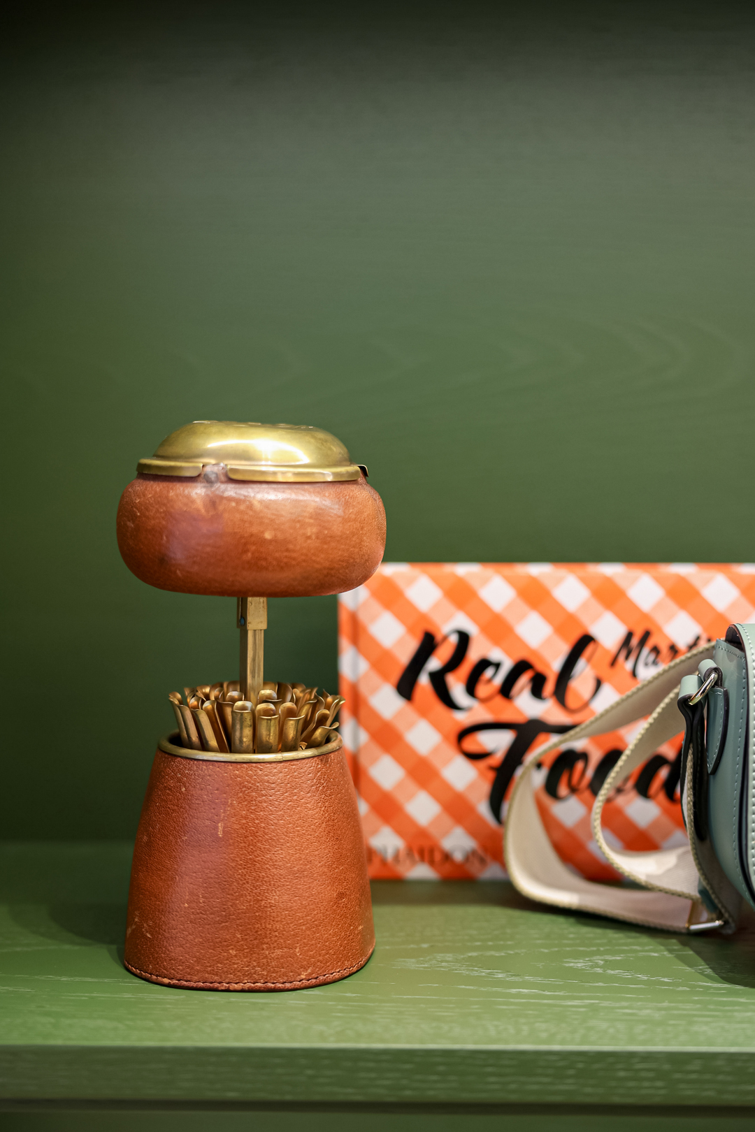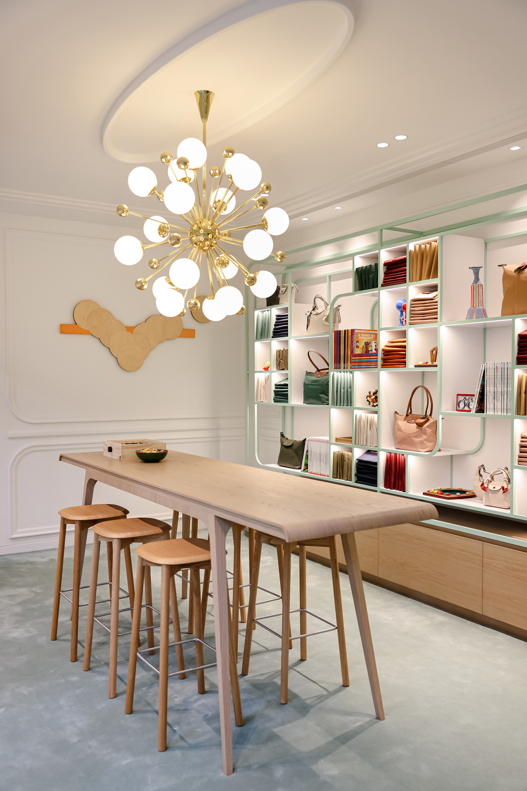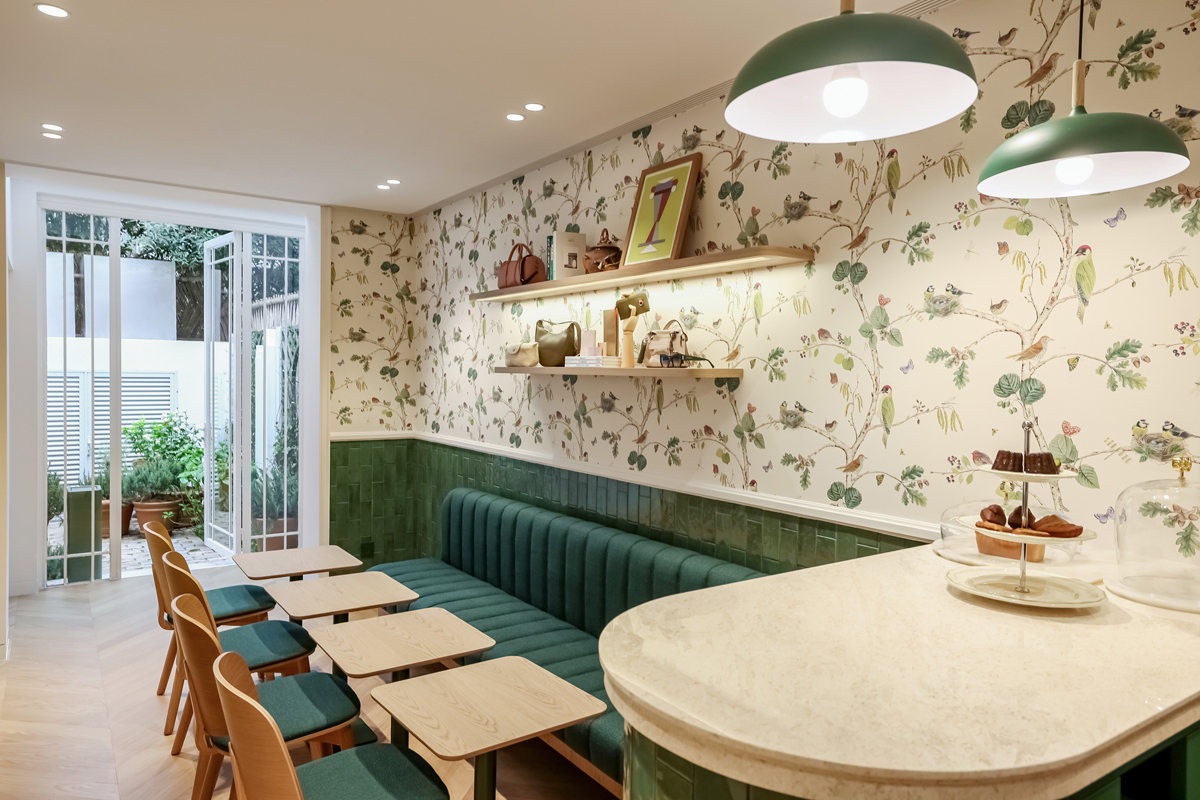 餐厅中央摆放着一张长餐桌与传统餐柜。来自法国卢瓦尔河谷、拥有两百年历史并被授予“活文化遗产企业”称号的Gien陶瓷餐具,搭配Café Longchamp的法式甜咸点心,如法式三明治、玛德琳蛋糕与可露丽,由常设的珑骧咖啡馆供应,为空间注入纯正法式风情。墙上装饰着David Nash的纸质艺术作品,厨房的鸟巢主题壁纸则向品牌标志致敬。